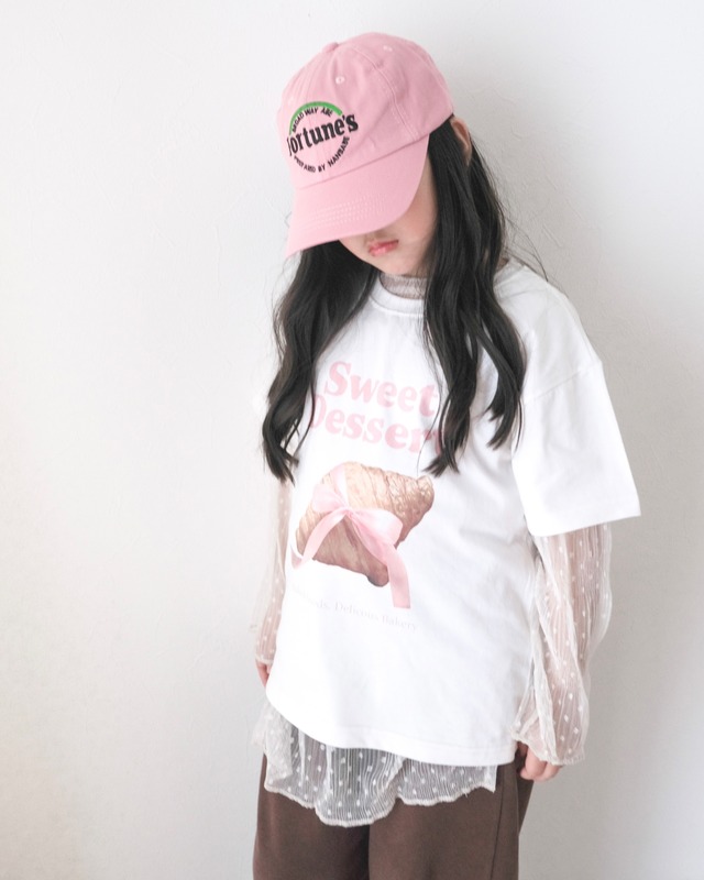 【即納】ninibello / dessert tee color / pink croissant size / XS(80-90) S(90-100) M(100-110) L(110-120) XL(120-125) やさしいパステルピンクのカラーはどんなスタイルにもマッチし、春夏のおしゃれにぴったりです♡ 軽やかなコットン素材で通気性も良く毎日のコーデに大活躍するアイテムです♡ パンツ、スカートどんなボトムでも合わせやすい一着です model 121cm 29kg JS着用 113cm 18kg L着用
